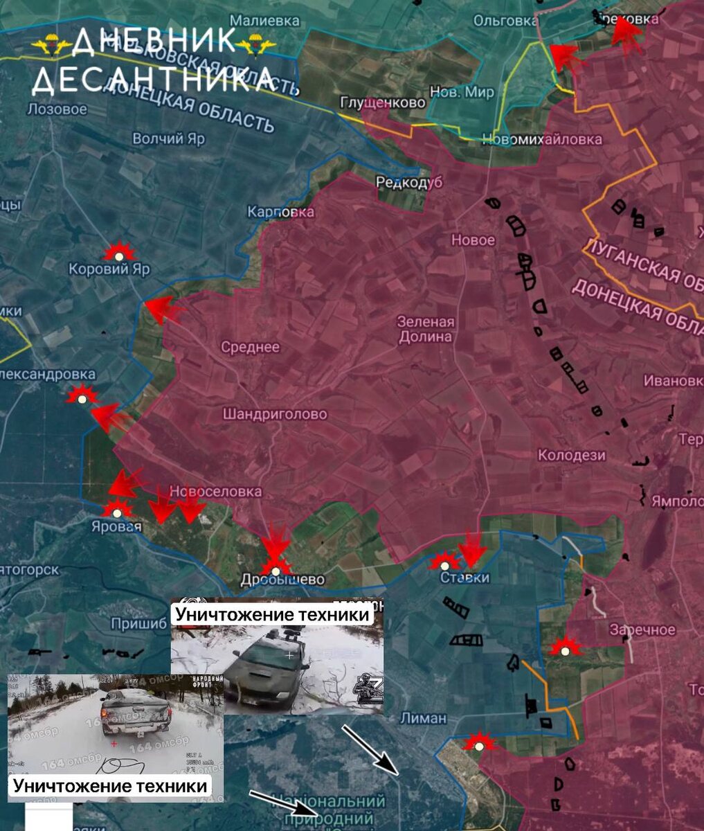 ▫️Силами бойцов 20 армии и 1-й танковой армии продолжаются тяжелые бои на участке. ▫️В Петровском (Грековке), а также в лесном массиве у Ольговки идут бои. ▫️По Коровьему Яру и окрестностям в опорных пунктах и лесополках наши войска уничтожают живую силу и технику ВСУ. ▫️Южнее от Александровки в лесном массиве наши войска расширили контроль территории. ▫️Северо-западнее Яровой гвардейцы расширили территорию вплотную к границам села в лесном массиве, а также вдоль ж/д дороги продолжают пробиваться к Сосновому и ж/д станции Святогорск. Через лесной массив подошли вплотную к северо восточной части Яровой. В районе Стародубовской плотины, западнее Красного Лимана, уничтожен очередной вражеский автомобиль, подвозивший живую силу. Также велась работа по уничтожению живой силы противника, возводивших антидроновые сети. Еще один автомобиль противника двигавшего из Красного Лимана в Щурово ликвидирован на участке. Противник от зверохозяйства Красного Лимана пытается продвинуться к Ставк