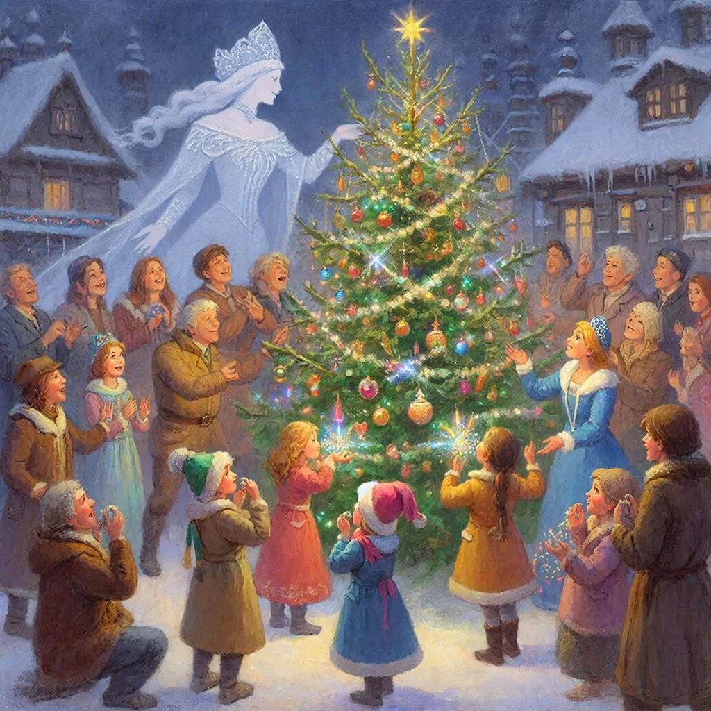 Воздух над площадью заискрился, как морозный узор на стекле. Из этой искрящейся дымки вышагнула… не фигура дедушки в красной шубе, а сама Зима. Не суровая и холодная, а элегантная, в платье из серебристого инея, с волосами, заплетёнными в косу из снежинок, и глазами цвета зимнего неба.