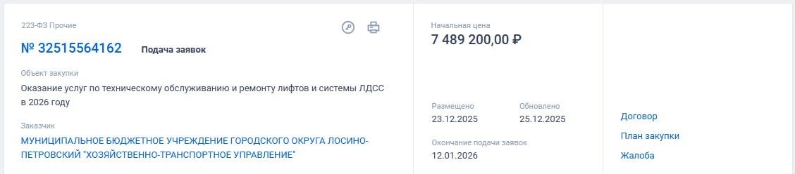 🛗 7 489 200 рублей планирует потратить городской округ Лосино-Петровский на оказание услуг по техническому обслуживанию и ремонту лифтов и