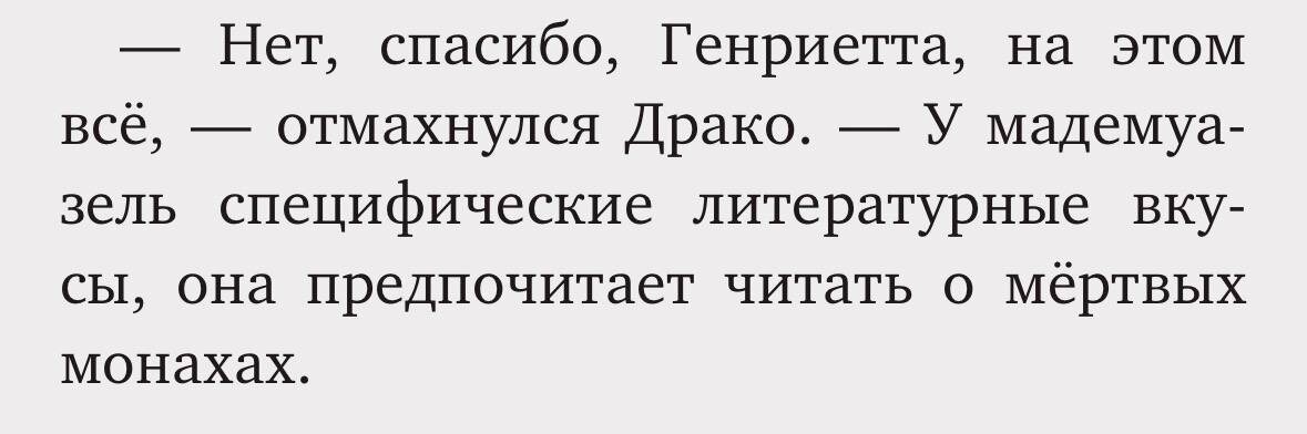 Дорогой Драко! Ты еще ничего не знаешь о специфических литературных предпочтениях! Мертвые монахи — сказка для младших учениц начальной школы литературных изысков!