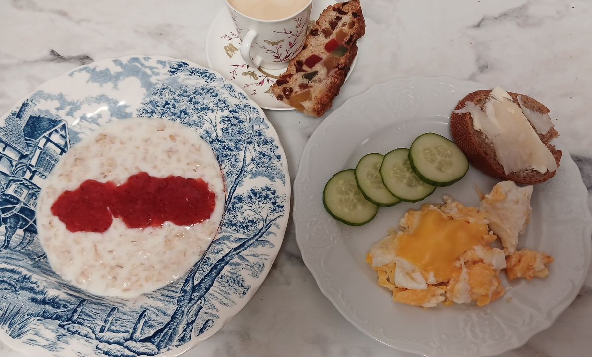 На январь я взяла сумму на питание в размере 70% от прожиточного минимума. На человека это 250 руб в день, в месяц - 7 739 руб. Утро начинаем с овсяной каши и яичницы. Кашу овсяную варю на половинном молоке или на воде, сегодня на молоке. Добавила в тарелки клубничное пюре. Яичница скрэмбл с ломтиком плавленого сыра, огурец и бутерброд с палтусом И к кофе - ломтик рождественского кекса. На обед был чечевичный суп, брала с собой на работу в термосе. На второе форель с овощами, примерно как вчера на ужин С работы приехала поздно. Сейчас еще и машину во дворе поставить вечером целый квест - сугробы выше головы. Долго искала место, поставила далеко от дома в итоге. И ужин быстрый (но запланированный!) - сосиски и овощи Сосиски у меня Глобус, их собственного производства, много лет их покупаем. Раньше вообще только их брали, сейчас еще из Вкусвилла покупаю. Меню год назад