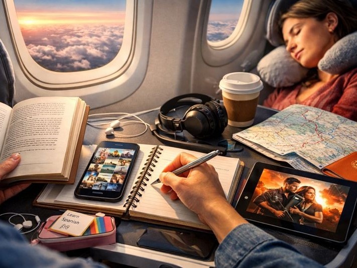 Интернет в самолёте — редкость. Но это вовсе не значит, что время в полёте тянется бесконечно. Наоборот: перелёт — это почти идеальное пространство, где никто не отвлекает, а значит можно сделать то, на что в обычной жизни не хватает времени. Я собрала занятия, которые действительно работают в дороге — проверено десятками перелётов. У многих из нас есть книги, которые «ждут своего часа». В самолёте этот час наконец наступает. Нет уведомлений, срочных дел и бытовых отвлечений. Даже 2–3 часа полёта позволяют погрузиться в сюжет или полезную литературу гораздо глубже, чем дома. Совет: заранее скачайте книгу или возьмите бумажный вариант — он особенно приятно ощущается именно в дороге. Самолёт удивительно хорошо подходит для размышлений. В режиме полёта мысли становятся спокойнее и чище. Что можно записать: Иногда такие заметки становятся отправной точкой для больших изменений. Во время перелёта можно наконец: Полезно, практично и очень освобождает память — и в телефоне, и в голове. Заране
