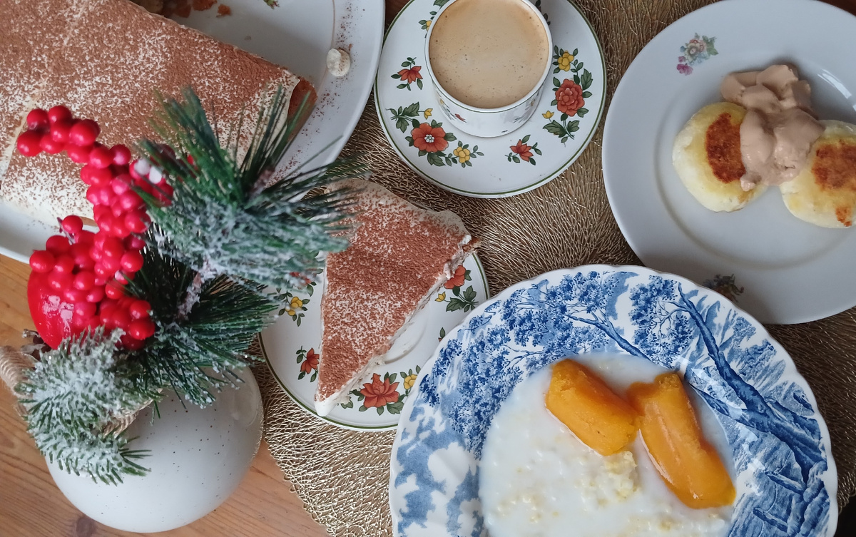 На январь я взяла сумму на питание в размере 70% от прожиточного минимума. На человека это 250 руб в день, в месяц - 7 739 руб. Завтрак: пшенно-рисовая каша с пюре манго, сырники, кофе и тирамису Торт пекла вчера вечером. На обед был суп со щавелем и крапивой, в тарелки порезала яйца. К супу - лепешки с огурцом, авокадо и форелью. Прямо подсели мы на такой вариант, очень вкусно и быстро. Главное, чтобы под рукой были тортильи. После обеда распаковала один рождественский кекс. Пекла я 2 шт в этом году. Очень красивый он в разрезе, пили кофе с кексом 😇 На ужин запекала в духовке картошку и язык под сыром, к картошке - маринованные огурцы, еще сок яблочный открыли Меню год назад Из запасов: крупы, манго, кофе, маскарпоне и сливки для торта, щавель для супа, тортильи, форель, кексы, язык, огурцы, сок