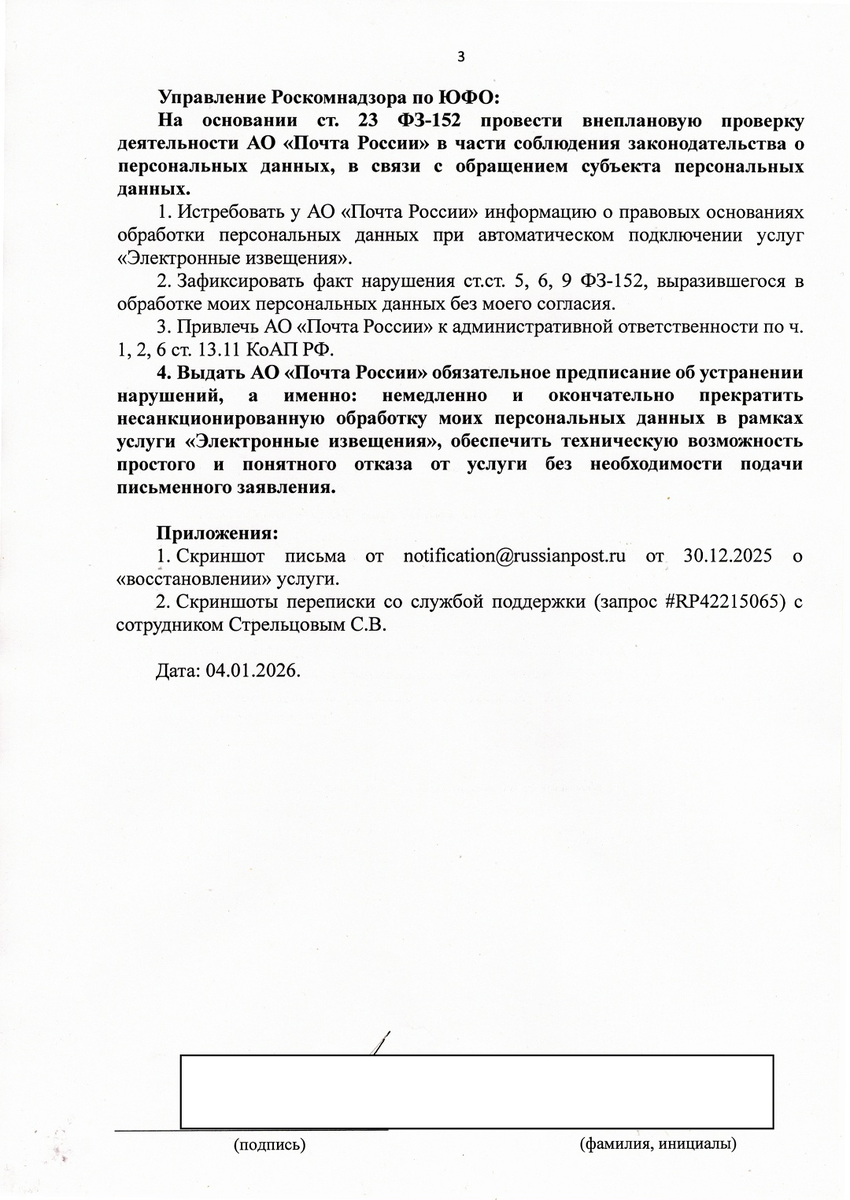 Я заявляю о грубом и систематическом нарушении АО «Почта России» (ОПС №350912, г. Краснодар, ул. 1-го Мая, 75) Федерального закона от 27.07.2006 № 152-ФЗ «О персональных данных», выразившемся в несанкционированной обработке моих персональных данных и навязывании услуги, а также о бездействии службы поддержки компании, делающем невозможным законное прекращение этой обработки.