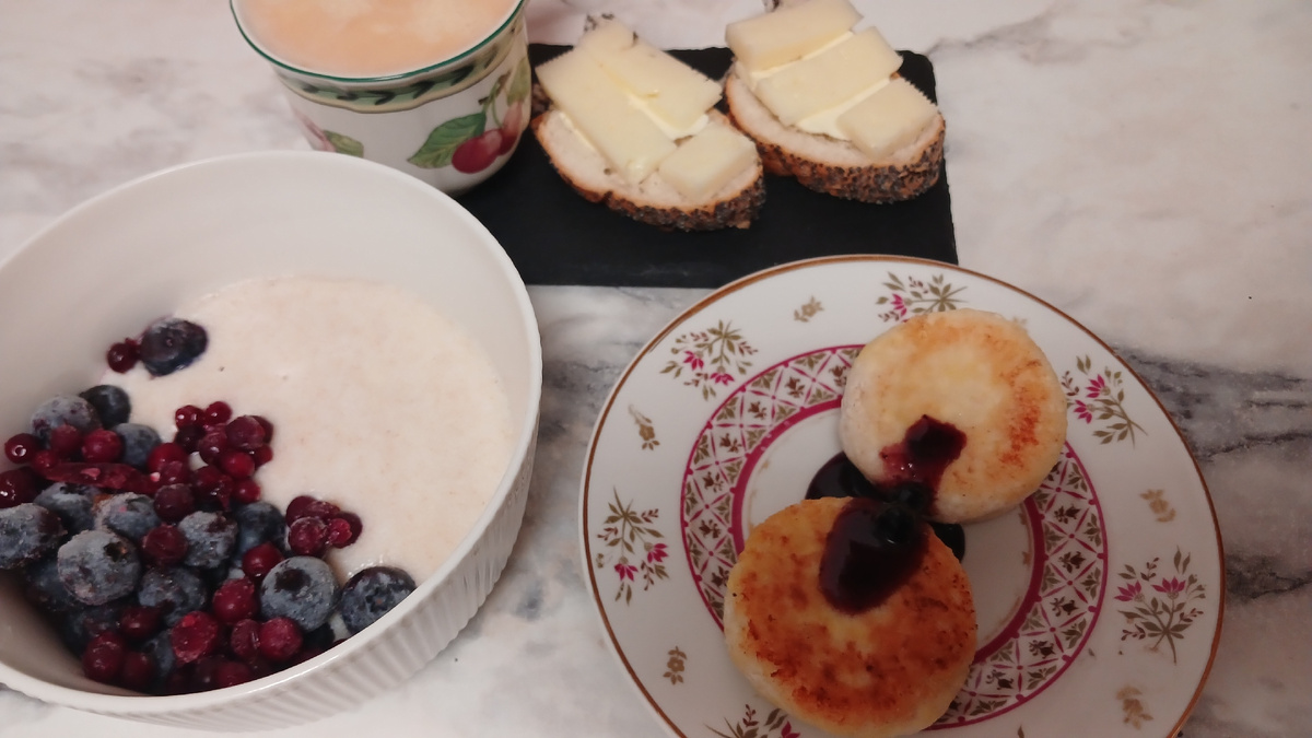На январь я взяла сумму на питание в размере 70% от прожиточного минимума. На человека это 250 руб в день, в месяц - 7 739 руб. На завтрак каша и сырники. Варила манку из полбы, в тарелки положила голубику и бруснику. Сырники (из домашних заготовок) с ложечкой черничного варенья. И к кофе еще бутерброды с сыром Обед брала с собой: борщ в термосе, на второе - руккола, картофельная вафля и запеченное филе голени индейки На ужин сварила картошку (почистила утром её), ставрида копченая, салат из свеклы с голубым сыром (заправка: бальзамик и оливковое масло) Меню год назад