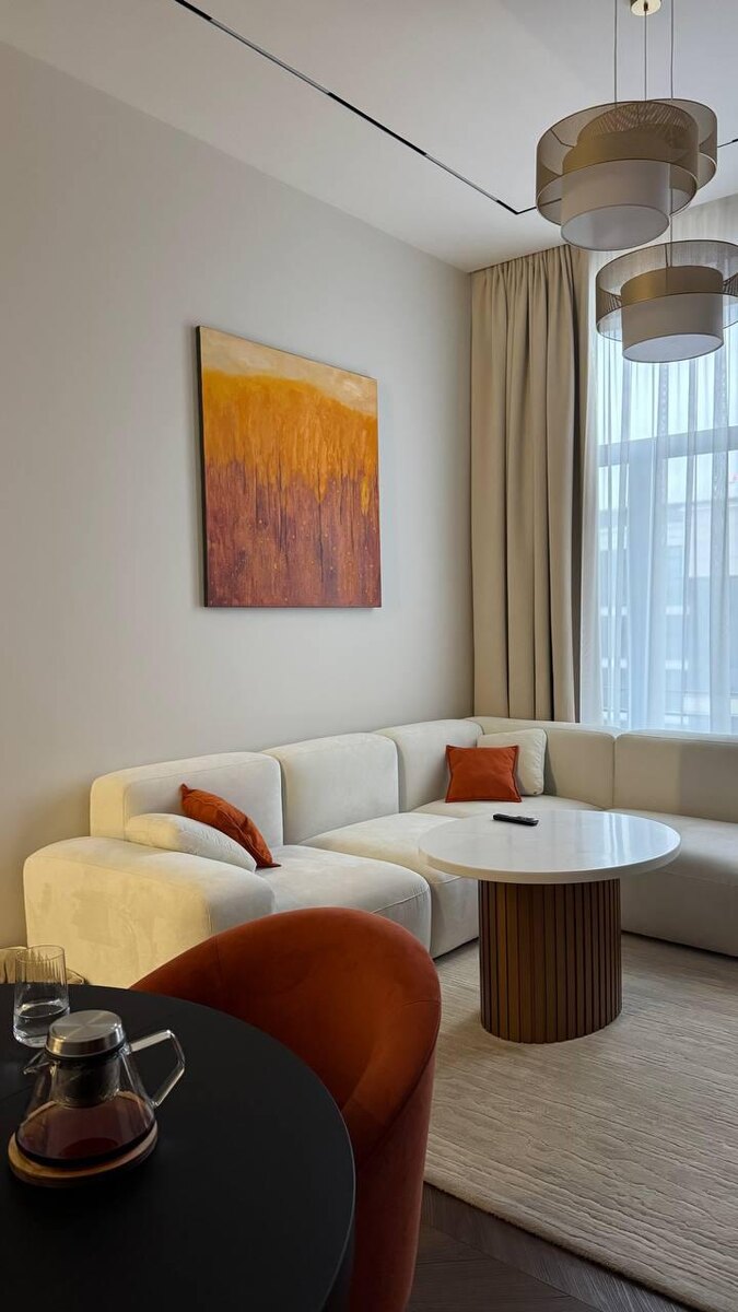 естественно и дорого. Здесь акцентный оттенок сначала появился в мебели: стулья задали тёплый терракотовый тон. Дальше мы подхватили его в более мягких деталях — подушках на диване, текстиле и предметах декора. За счёт этого цвет не выглядит одиночным пятном, а читается сразу в нескольких точках комнаты. Следующий уровень — искусство и графика. Картина поддерживает ту же цветовую температуру и усиливает акцент, но делает это деликатно: не кричит, а добавляет глубину и настроение. В результате цвет работает не как декор ради декора, а как часть общей композиции. Такой приём даёт сразу несколько эффектов: интерьер становится цельным и собранным; акценты не утомляют и не «перегружают» пространство; В итоге пространство остаётся светлым и спокойным, но при этом живым — с характером и теплом, которое ощущается сразу, как только заходишь в комнату.