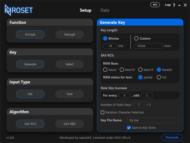 ROS Encryption Tool (ROSET) — это кроссплатформенное приложение с открытым исходным кодом, предназначенное для демонстрации и использования экспериментальных алгоритмов симметричного шифрования SAS-RCS и SAS-RBS. Инструмент ориентирован на высокую скорость работы и предоставляет пользователям полный контроль над параметрами криптографических процессов. * Поддержка алгоритмов нового поколения: Полный доступ к SAS-RCS (Random Character Substitution) для текста и SAS-RBS (Random Binary Substitution) для бинарных данных. * Многопоточная обработка: Реализована поддержка параллельного и многоточечного шифрования, что значительно ускоряет работу с файлами больших объемов. * Гибкое управление ключами: Упрощенный интерфейс для генерации, импорта и настройки ключей с переменной длиной. * Кроссплатформенность: Работает на Windows, Linux и macOS без необходимости установки (Portable-версия). * Отсутствие зависимостей: Приложение является автономным и не требует установки дополнительных библиотек и