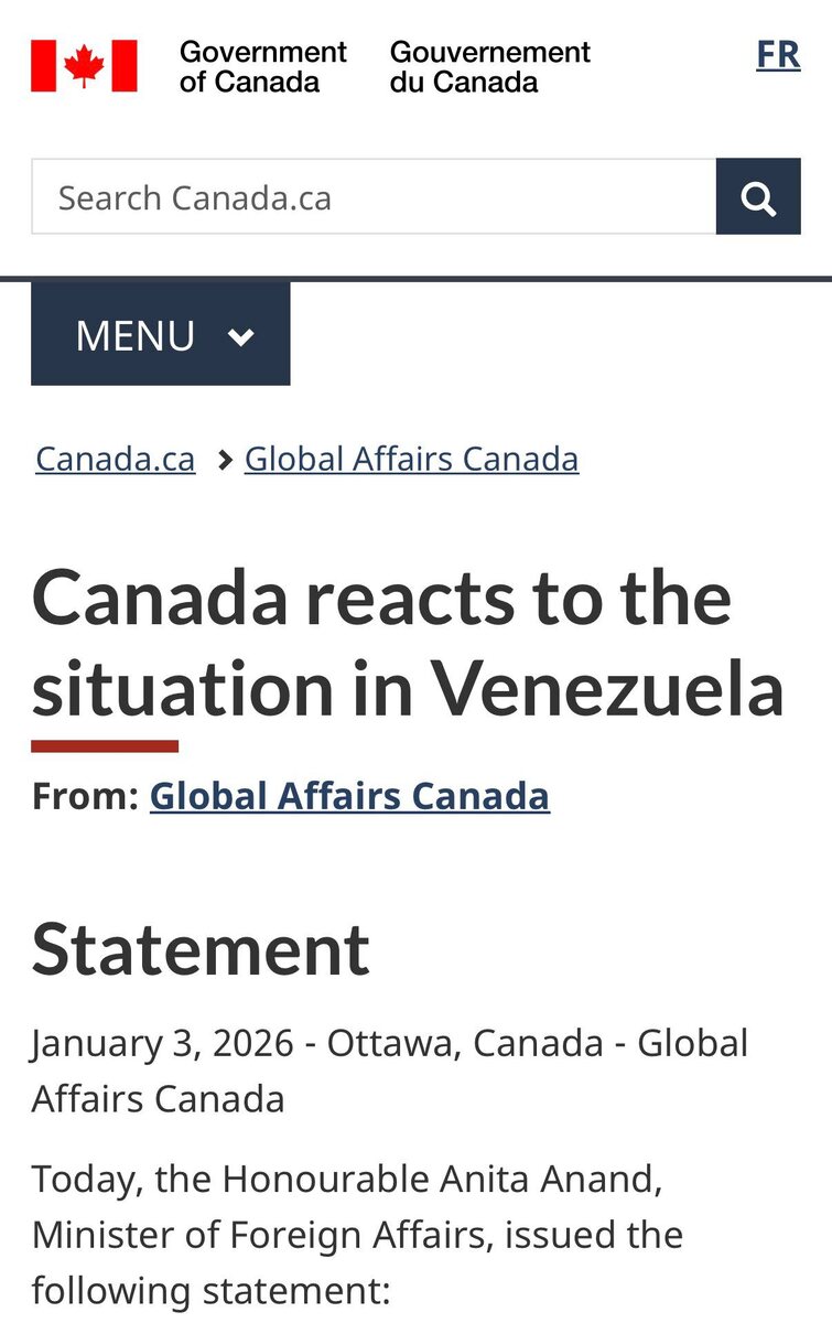 Если кратко, она была против диктатора и призывает все стороны проявлять сдержанность. https://www.canada.ca/en/global-affairs/news/2026/01/canada-reacts-to-the-situation-in-venezuela.html P.S. Небольшими шажками желание Трампа присоединить Канаду потихоньку приближается. Или мне показалось?