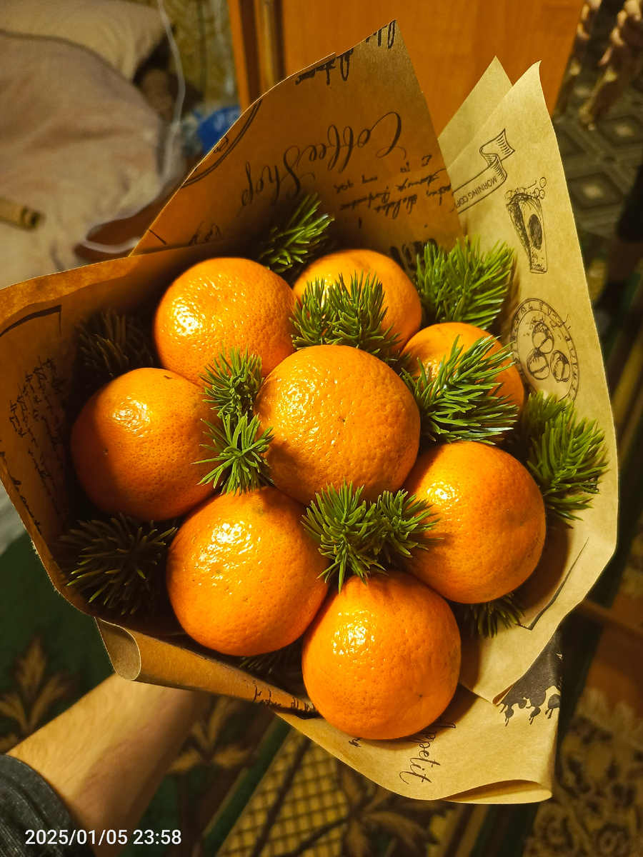 Представьте: вместо привычных цветов — яркий, ароматный букет из сочных мандаринов. Он не только радует глаз, но и дарит неповторимый цитрусовый аромат, создаёт праздничное настроение и даже может стать вкусным угощением. Такой подарок особенно уместен зимой, на Новый год или день рождения — он выглядит оригинально и обходится гораздо дешевле цветочной композиции.