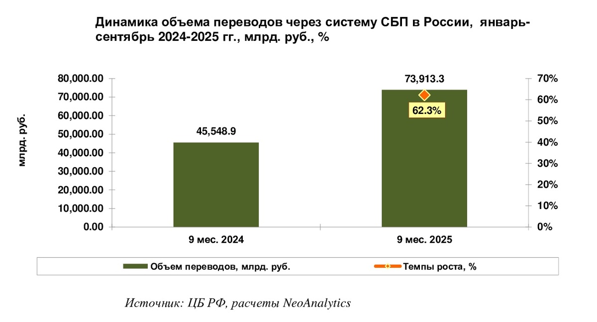 В ходе исследования, проведенного NeoAnalytics на тему «Российский рынок платежей: итоги 2025 г., прогноз до 2029 г.», выяснилось, что на основании данных официальной статистики в 2025 г. объем переводов через систему быстрых платежей (СБА) существенно вырос. Так, в стоимостном выражении объем переводов через СБП по итогам девяти месяцев 2025 г. увеличился на 62,3% по отношению к аналогичному периоду годом ранее и составил 73 913,3 млрд. руб. В 2024 г. объем за этот же период был зафиксирован на уровне 45 548,9 млрд. руб. В натуральном выражении количество переводов через (СБП) выросло на 44% относительно аналогичного периода 2024 г. и составило 13 311 млн. ед. В 2024 г. количество переводов было зафиксировано в районе 9 252,8 млн. ед. Объем переводов через СБП в третьем квартале в 2025 г. вырос на 6,8% по отношению ко второму кварталу 2025 г. и был зафиксирован на отметке в 26 522,8 млрд. руб. Несмотря на то, что динамика в третьем квартале замедлилась, объем переводов в 2025 г. опере
