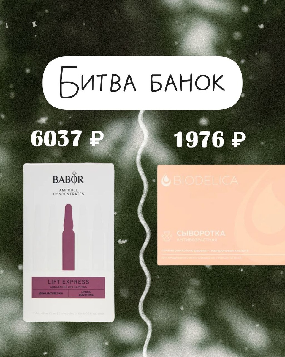 Сравниваем две антивозрастные сыворотки в ампулах: • Biodelica 1976 ₽, курс 14 дней • Babor 6037 ₽, курс 6 дней Что у них общего • водная увлажняющая база • эмоленты для смягчения кожи • стандартные консерванты • обе работают с признаками старения А теперь самое интересное, в чём разница. Babor это формат интенсивного бустера • экспресс-лифтинг • визуальное выравнивание рельефа • морские и растительные экстракты • ампулы на короткий курс Работает как скорая помощь перед событием, после перелёта, когда лицо «устало жить». Дорого, быстро, эффектно, но так же быстро заканчивается Biodelica же, стратегия вдолгую. Это ежедневная антивозрастная сыворотка • пептид Palmitoyl Hexapeptide-12 стимуляция коллагена • гиалуроновая кислота, стабильное увлажнение • растительные экстракты семян для питания • лактобактерии для поддержки микробиома • без отдушки Не даёт вау-лифтинга за вечер, зато работает на качество кожи. Будет вам и плотность, и упругость, и комфорт, и восстановление Если говорит