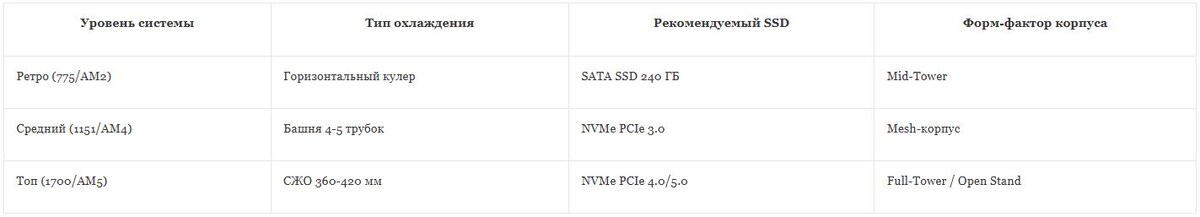 - Сбалансированный вариант - Core i5-13600K, 32 ГБ DDR5 6000 МГц, видеокарта RTX 4070 Super, БП 750 Вт.