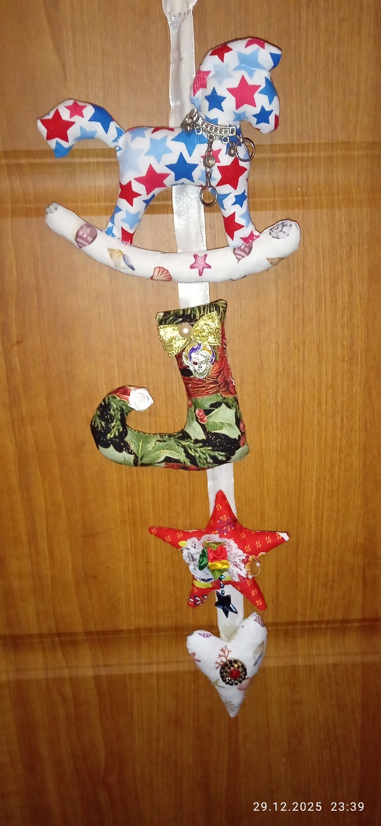Доброго времени суток мои хорошие. Я всё таки сделала подвеску новогоднюю, думала не успею до НГ. Но судьба благоволила мне и я успела сделать, всё задуманное. Приношу извинения,что поздно показываю.. Есть у меня задумки каждый год делать подобную подвеску с символом года. Делается не сложно. Нам всего то потребуется нитка-иголка, кусочки ткани и что то для набивки игрушек.Ах,да ещё тесёмочки, бусинки,да хоть сломанную бижу для украшения. Выкройку делала только для коника. Остальное прямо на ткани рисовала. Сшила, вывернула, набила синтепоном. Украсила. На длинную ленточку пришила. Вот и готова подвеска, хоть на двери, хоть на ёлку, а можно и в качестве маленького презента преподнести. Только следующие игрушки, я не буду пришивать к ленте, хочу попробовать липучки пришить, чтоб можно было и местами менять и другие игрушки вешать. Например иметь один подвес, а символ год менять. Но это пока в планах. Хоть бы не забыть, что придумала.😁😁😁😁 Остатки елочек недодаренных)) На р
