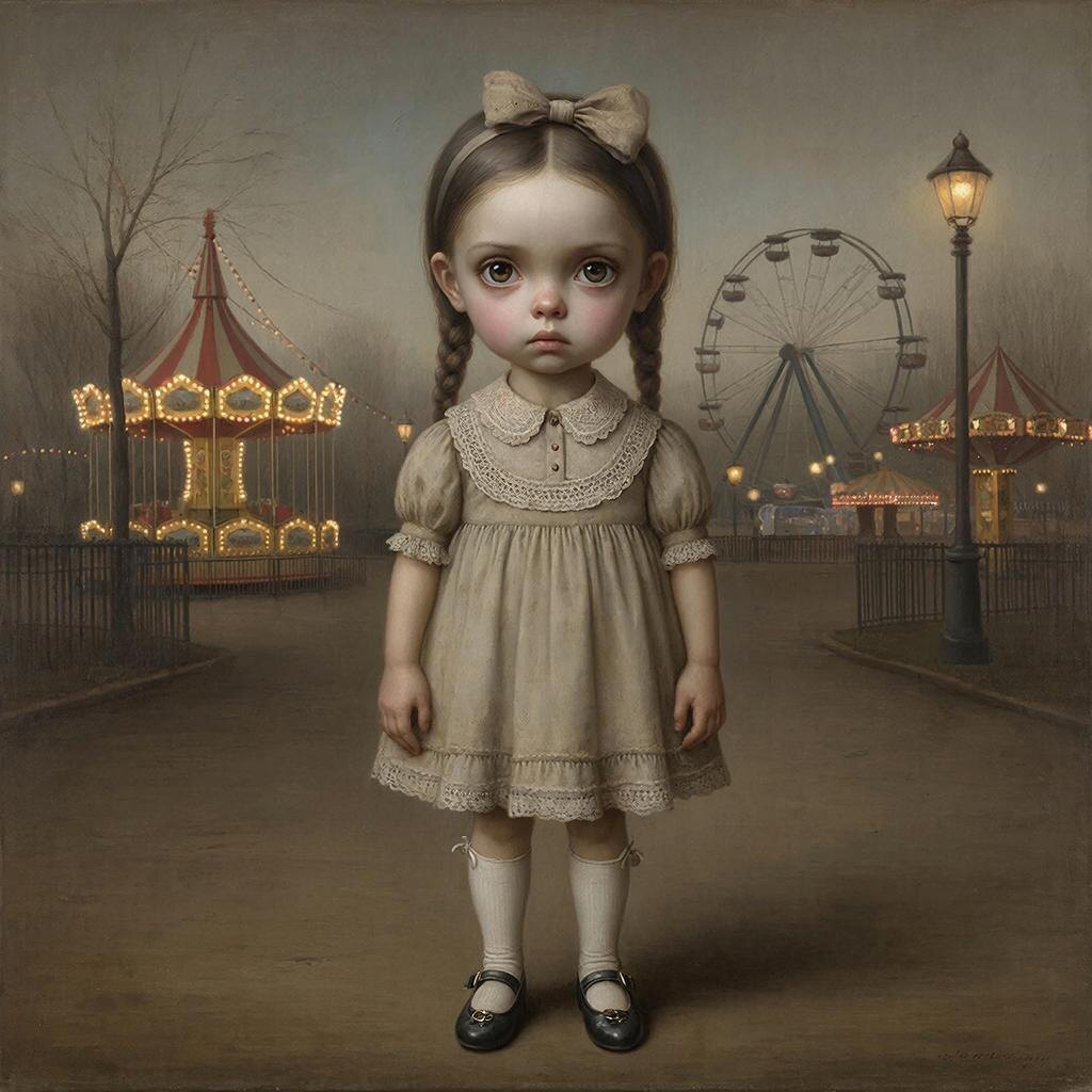 - визуально ярка — образ девочки в старинном платье на фоне каруселей создаёт резкий контраст;