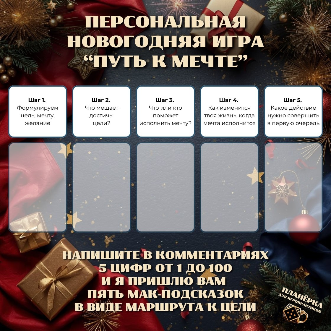 ! 🎉 Сегодня не просто начало 2026 года — сегодня ровно 1 год нашему каналу. Спасибо вам за каждый лайк, комментарий, репост и — самое главное — за то, что вы были рядом. 💛 Чтобы встретить год с легкостью, игрой и маленькой магией — приглашаю вас в персональную новогоднюю игру «Путь к мечте» 🎯✨ 📌 Как играть: - Загадайте желание. Без ограничений, просто мечтайте! - Напишите в комментариях 5 цифр от 1 до 100 в рядок — например: 5, 16, 43, 1, 89. - Я пришлю вам 5 магических подсказок — по одной на каждую цифру. - Когда получите подсказку — ответьте парой слов: что почувствовали, что поняли, что решили — и обязательно скажите "спасибо" 😊 👉 Это не гадание — это ваш маршрут к цели, составленный с любовью и вниманием. Пусть все ваши мечты исполняются — как можно скорее и в самом лучшем виде 🌟 Жду ваших цифр в комментариях — начнём вместе! P.S.💡 Игра работает только через комментарии — так мы создаём общее пространство намерения и поддержки. Не стесняйтесь писать — даже если пока