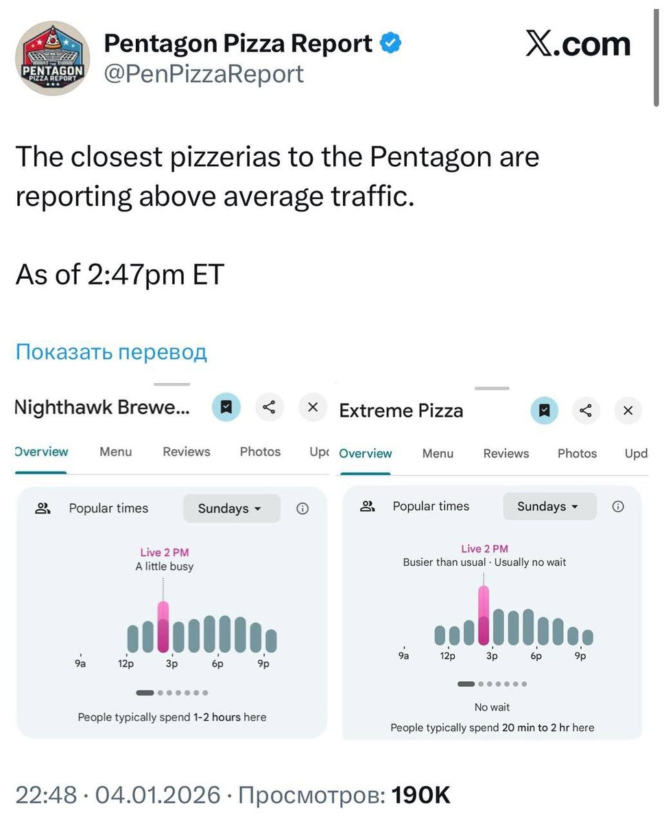 В пиццериях вокруг Пентагона опять повышенная активность, как было до удара по Венесуэле