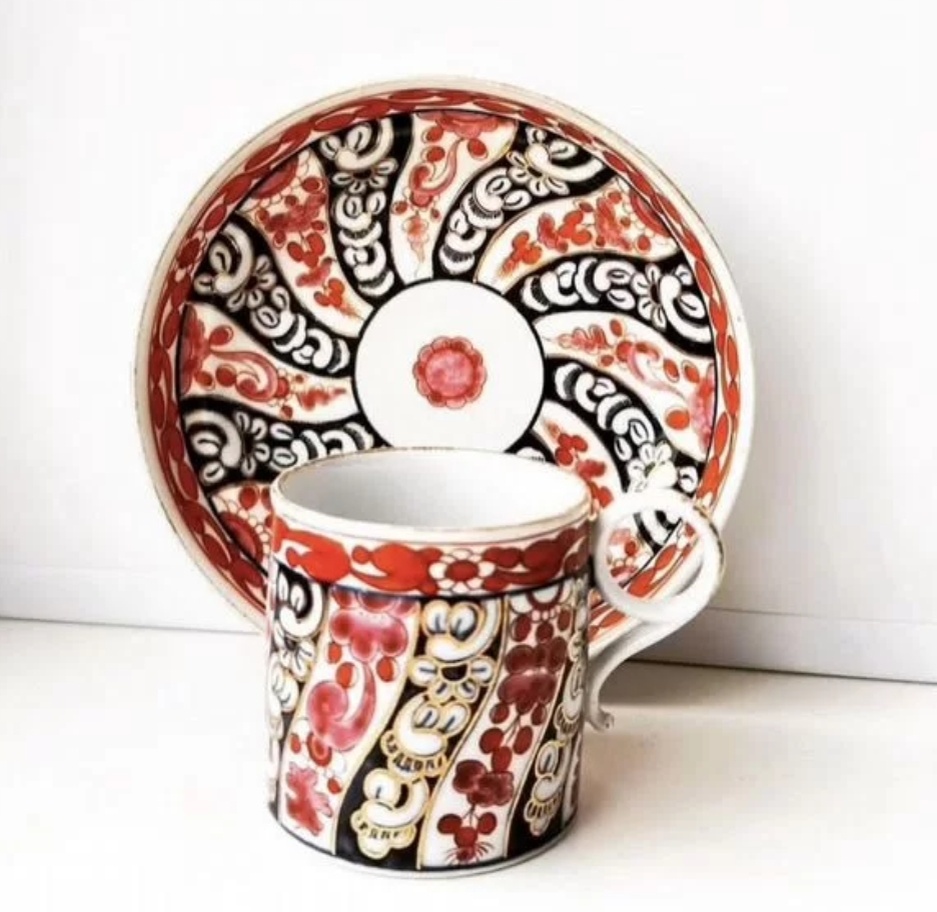 Есть среди дизайнов английской мануфактуры Royal Worcester один паттерн, который был очень популярен на рубеже 18-19 веков. Изделия с запоминающимимся узорами синих и красных завитков можно встретить и на Авито, и на Кристис.