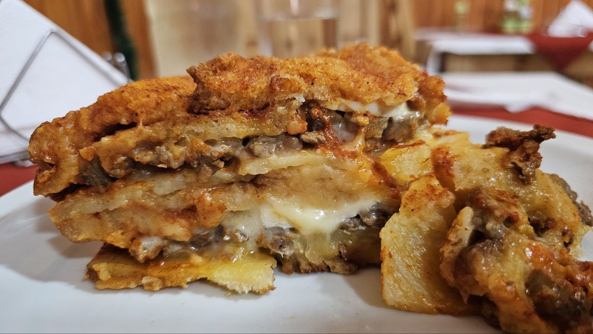 Меню нет в принципе. Есть только хозяйка и её рассказ. Решили попробовать что-нибудь местное. Из местного, помимо канеллони, нашёлся jigote (хиготе). Его и взяли. «Как пицца», — сказала хозяйка. На самом деле плотная картофельно-мясная запеканка с яйцом и сыром. Цена — 12 000 песо (7,8 $). Порция — такая, что одного jigote хватило на двоих. #цены #еда