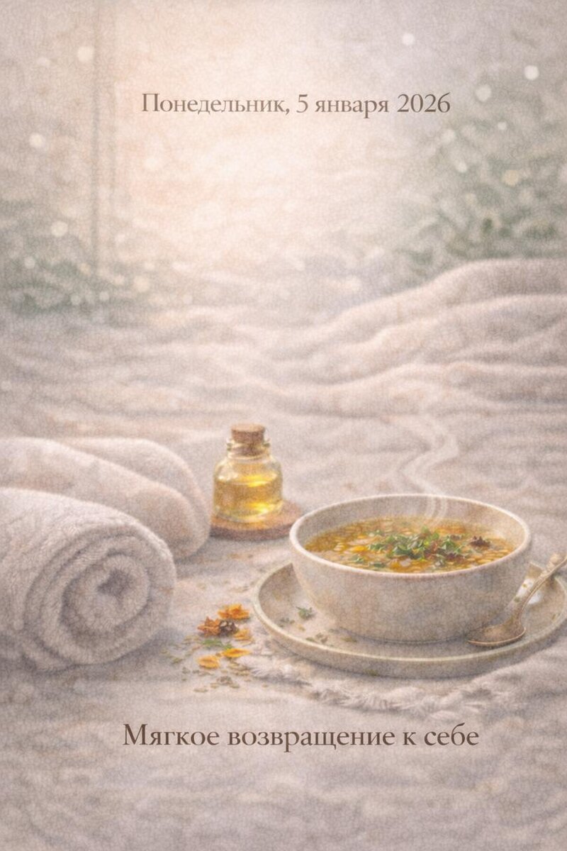 » Переходная неделя: ещё празднуем — но уже на излёте. Тело хочет покоя, а ум — структуры. Эта неделя про мягкое возвращение к себе, к ритму, к ясности. ✨Зачем телу сегодня: Агни колеблется. Вата усилилась из-за сбитого режима, Питта раздражается из-за «не сделано», Капха просит всё оставить, как есть. Самое лучшее, что можно сейчас — поддержать тело в возвращении без насилия. 📌Действие на неделю: 1. Утро без телефона первые 30 минут. Вместо него — тёплая вода и масло на стопы. 2. Один «нормальный обед» в день Горячая, свежая, простая еда за столом, а не вразбег. 3. Маленькое завершение Каждый день — одна незакрытая вещь с прошлого года (письмо, сообщение, полка). ⛔Чего не делать: Не строй планы на год, когда тело хочет только выспаться. Сначала укорени себя — потом строй. ✅Мини-чек-лист: – Я пью тёплую воду утром – Я ем горячее 1 раз в день – Я не критикую себя за замедление – Я ложусь до 23:00 хотя бы 3 дня – Я убрала 1 «хвост» декабря ⚠Мини-тест: кому осторожно Если в тел