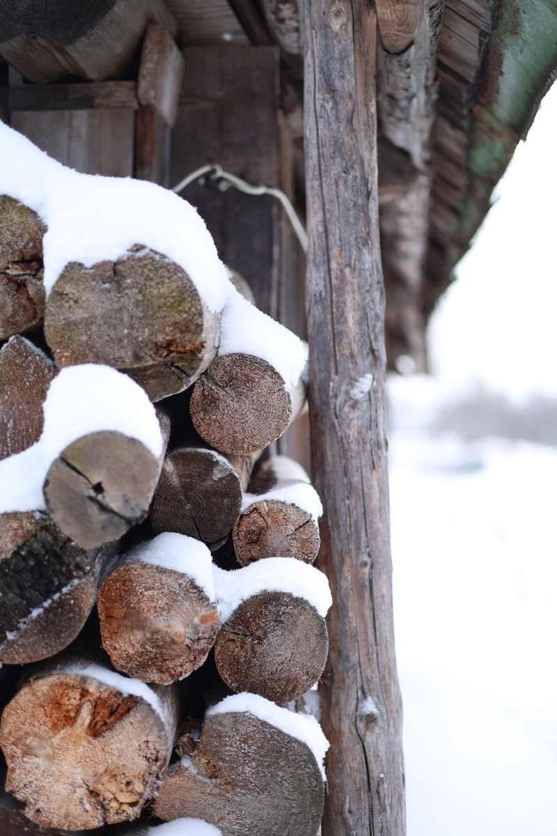 У старого деревянного сарая аккуратно сложены дрова — надёжный запас тепла на долгие морозные вечера. Каждое полено покрыто тонким слоем снега, словно природа сама