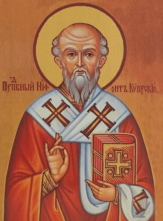 Преподобный Нифонт родился в IV веке в Пафлагонии. Ребенком Нифонт было очень добрым, набожным, часто посещал церковные службы, потом уехал учиться в Константинополь и поддался страстям, начав вести порочную жизнь. Иногда он осознавал, что падает в бездну, однако считал, что не заслуживает прощения, поэтому возвращался к своим грехам. Встретив однажды своего давнего друга, Нифонт удивился, что тот пристально рассматривает его лицо. Оказалось, что друг видит его черным, как у эфиопа. Нифонт испугался, он осознал, что на лице лежит печать его греховной жизни. Он стал взывать ко Пресвятой Богородице, умоляя Ее стать ходатаицей за него перед Господом. Долго взывал грешник к Небесной Заступнице, и вдруг лик Ее на святой иконе просветлел, и Она улыбнулась. С той поры Нифонт стал усердно молиться Божьей Матери перед Ее святой иконой. Если он возвращался к греховной жизни, Богоматерь на иконе отворачивала от него Свой лик. После покаяния и слезной молитвы Богородица вновь милостиво смотрела н