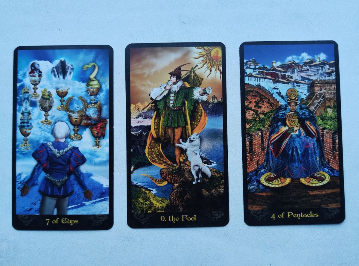 Карты сегодняшнего дня: Семёрка Кубков, Шут и Четвёрка Пентаклей