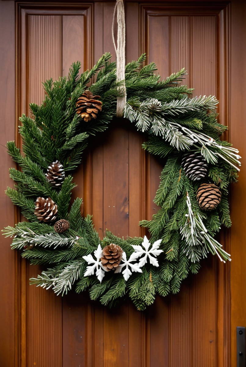Заснеженный хвойный декор, это превосходная основа для создания композиции в лаконичном скандинавском стиле. Его ключевые принципы — натуральность, простота и уют. Классический венок с шишками, припорошенный снегом, уже является выразительным элементом. Ваша задача — лишь деликатно подчеркнуть его красоту, продумав гармоничное сочетание украшений.