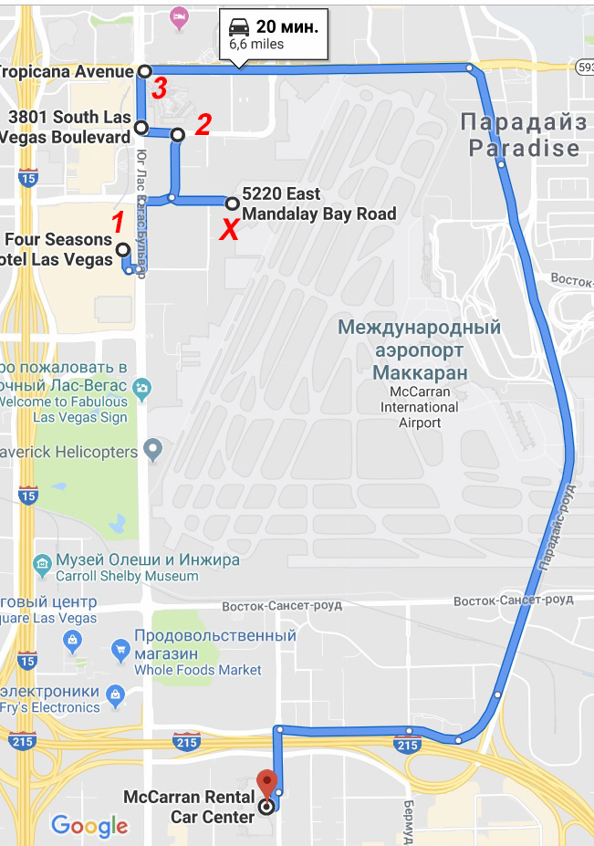 Выезжаем из отеля (позиция 1). Я тут же пересекаю бульвар Лас Вегас, еду вперед к аэропорту и…упираюсь в тупик (позиция X).