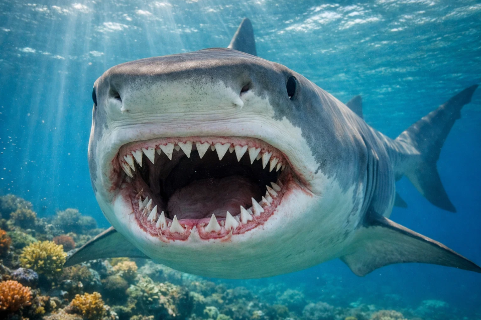 Ее голова крупная, с характерным тупым, почти прямоугольным рылом, что придает ей узнаваемый и грозный профиль. Но истинный предмет ужаса и восхищения — ее пасть. Челюсти тигровой акулы оснащены уникальными зубами, которые являются эталоном универсальности в подводном мире. Каждый зуб имеет форму зазубренного серпа с глубоким вырезом по краю. Эти зубчатые лезвия работают как идеальный комбинированный инструмент: они способны разрезать плотную кожу и мышцы крупных морских животных, дробить прочные панцири морских черепах, а также перепиливать кости и твердые предметы. Такая морфология зубов напрямую связана с невероятно широким рационом этого хищника.