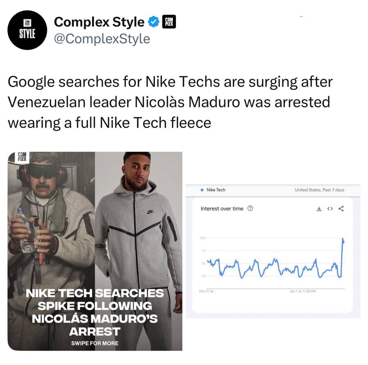 Плохой рекламы не бывает. Продажи спортивного костюма Nike подскочили после публикации фотографий задержанного Мадуро. На официальном сайте Nike распродана половина размеров серых спортивных костюмов Nike Tech Fleece, в котором задержали президента Венесуэлы Николаса Мадуро в Каракасе.