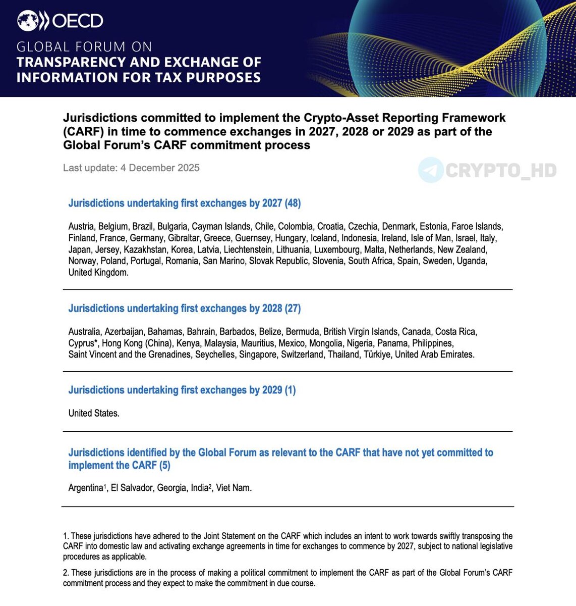 С этого года криптосервисы в 48 странах начнут фиксировать транзакции пользователей для налоговых целей. Обмен этими данными между государствами стартует в 2027 году в рамках стандарта CARF (OECD). Что это значит: ▪️ Под отчетность попадают CEX, часть DEX, криптобанкоматы, брокеры. ▪️ Сбор данных начинается заранее, еще до официального запуска. ▪️ Цель – борьба с уклонением от налогов и отмыванием денег. ▪️ Еще 27 стран подключатся позже, с 2028 года. ▪️ В числе юрисдикций: большинство стран ЕС, США, ОАЭ, Казахстан, Армения, Азербайджан, Турция, Гонконг, Великобритания и др. По оценкам TaxBit (компании, разрабатывающей налоговое ПО для крипторынка), эти данные со временем могут использоваться не только для налоговой отчетности, но и для идентификации владельцев криптоактивов. Crypto Headlines