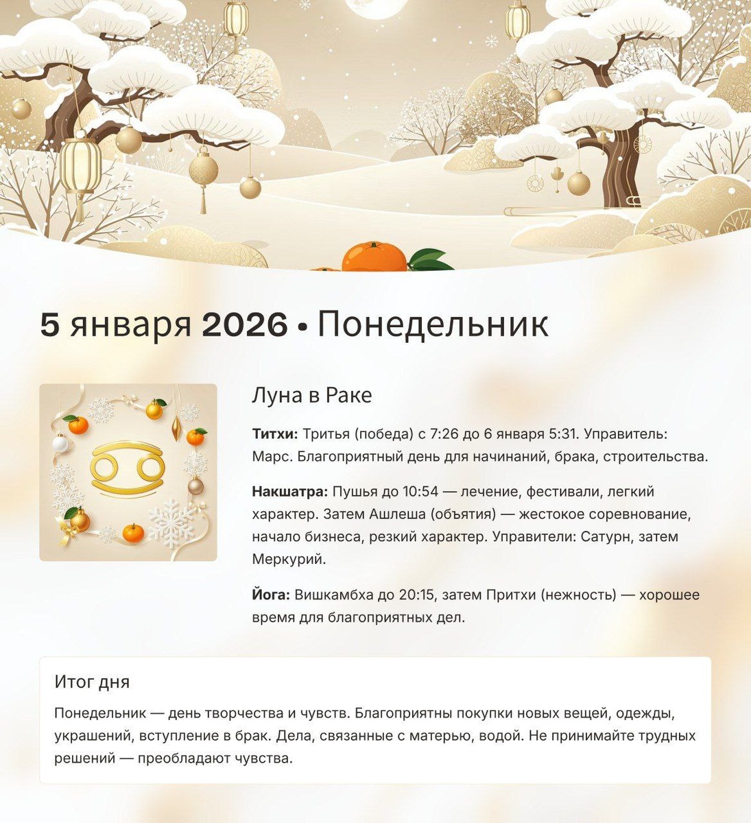 ! 🌙 Вселенная выстроила сегодня чёткий ритм из трёх фаз. Попади в него - и день пройдёт на мощной волне. ⚫️ ДО 10:55 - СТАРТ МЕЧТЫ Сиддхи Йога! Луна в Раке встречает благословенную Пушью. ⚫️Действуй: запускай проекты, договаривайся, покупай важное, проси о помощи. Вселенная ставит зелёный свет. ⚫️Девиз дня: Кто раньше встал - того и тапки. 🔥 С 10:55 - ГЛУБИННАЯ ЧИСТКА Луна переходит в проницательную Ашлешу. Энергия меняется на внутреннюю работу. ⚫️ Действуй: разбирай завалы (в доме и в голове), займись йогой, проработай обиды, подай документы "на отсечение". ❌ Не начинай ничего нового - время для анализа и очищения. 🌙 ПОСЛЕ 18:23 - ТИХИЙ РЕЖИМ Включается карана Вишти (Бхадра). Вселенная советует сбросить обороты. ✅ Действуй: отдых, чай, спокойное общение, завершение утренних дел без спешки. ❌ Избегай важных решений, споров и новых стартов. 🌌 ГЛАВНЫЙ СЕКРЕТ ДНЯ: Создавай утром, очищай днём, отдыхай вечером. Действуй вовремя - и результат придет сам. Хорошего старта недели! ✨