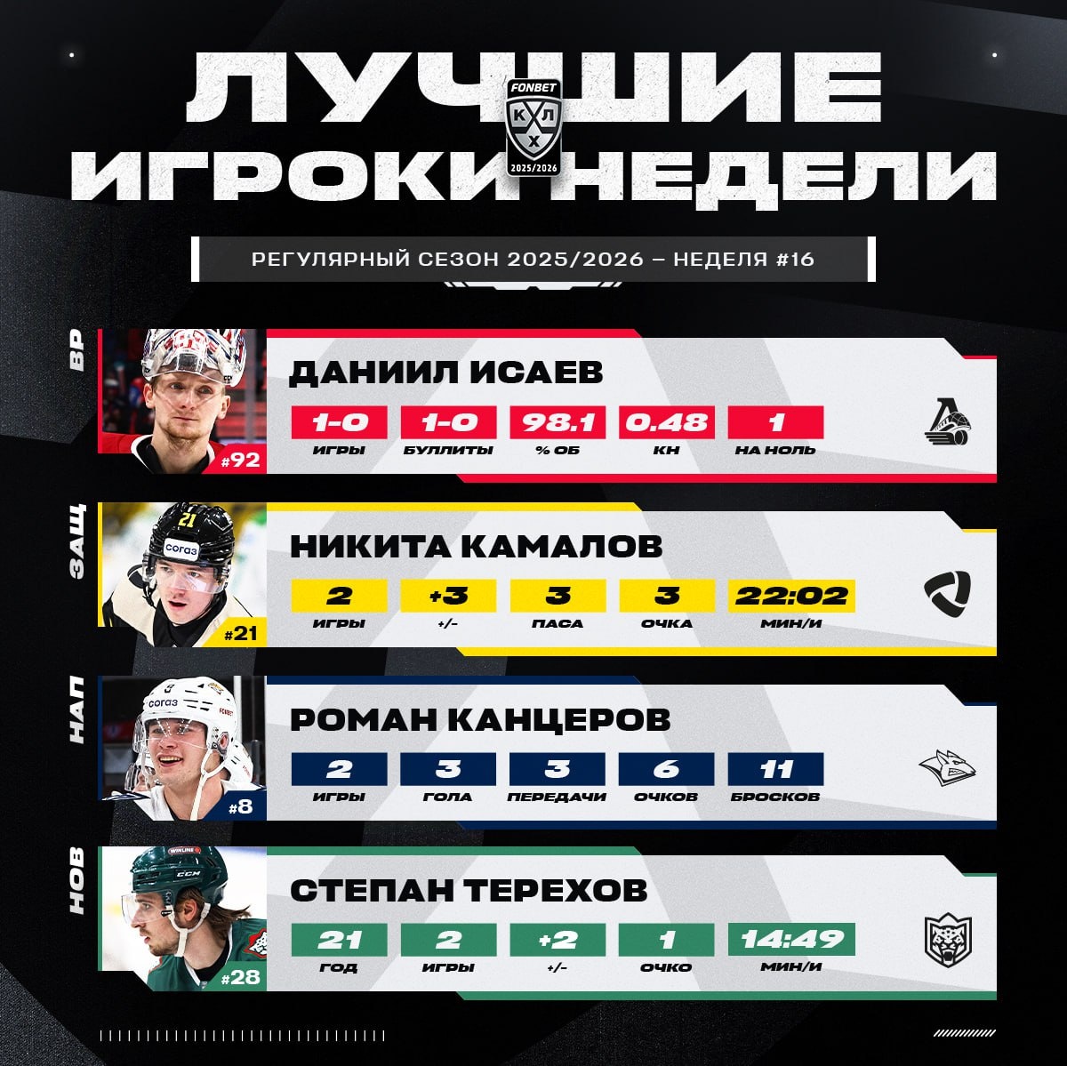 КХЛ определила лучших игроков 16-й недели сезона 2025/2026.