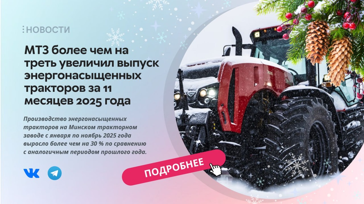 🔰МТЗ 🙂 более чем на треть увеличил выпуск энергонасыщенных тракторов за 11 месяцев 2025 года
