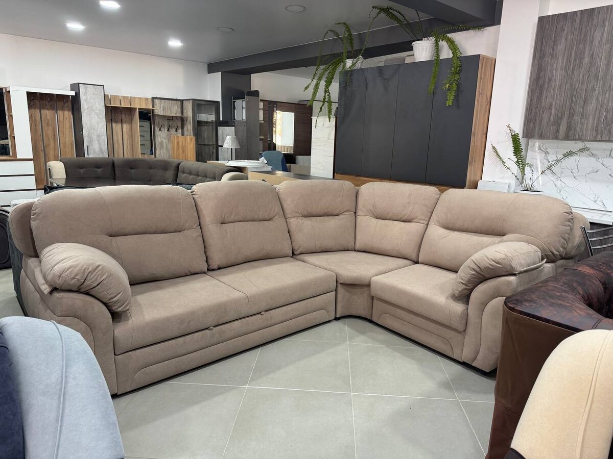 В центре внимания находится большой угловой диван бежевого цвета с мягкими подушками. Диван выполнен в классическом стиле, с обивкой из ткани. Он состоит из нескольких секций, что позволяет удобно расположиться нескольким людям.