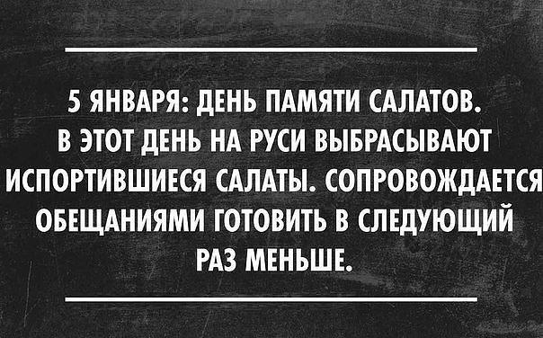 Всех заглянувших рада приветствовать❄❄❄ Делитесь, как вы? Как ваше состояние, здоровье? Как проходят ваши праздничные дни? Ну что ж дорогие, вот и пошел уже пятый день Нового года. В этот день, в народе отмечается несколько дат🤣👇. Именно так у меня сегодня и происходило с утра🙈. Выбросила пару последних недоеденных салатов🤦♂️ и, в который раз, клятвенно пообещала себе готовить в следующий раз меньше. Хотя вроде ж итак немного было приготовлено. И должно было все съесться!!! Но у нас пошло все не по плану. 31, в новогоднюю ночь мы накрыли стол, дождались курантов, и вышли на улицу поздравить с наступившим праздником наших друзей с соседнего подъезда. Погода жителям Кузбасса сделала новогодний подарок. В праздничную ночь температура у нас в городе была -1. Потусили чуток на улице, договорились, что первого числа все встречаемся у нас и разошлись. А первого января дочь проснулась с температурой и мы поняли, что все наши планы растворились.... Но ничего не поделаешь, раз так получил