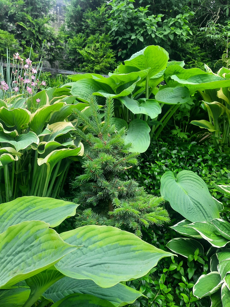 Еще одна голубая елочка рядом с хостой. В ногах - очиток ложный.