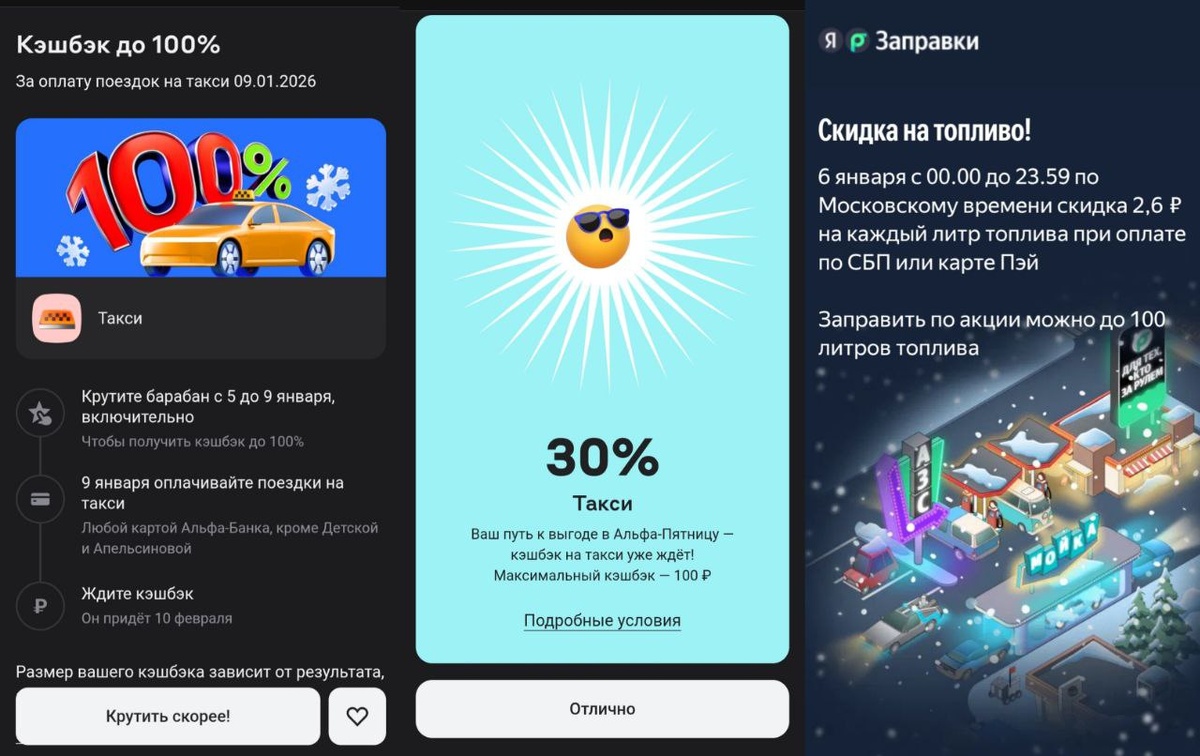 💸 Яндекс Банк Крутим рулетку на доп. категорию. У кого не отображается в приложении, пробуйте по ссылке: https://sp.yandex.ru/wheel В этот, раз мне выпало 15% на концерты ❤️Альфа-Банк В Альфа Пятнице уже доступна категория Такси до 100% кэшбэка. В поиске набираете "такси" и крутите рулетку. Лимит 100-1000₽ (МСС 4121, 3990), но оплата только в пятницу 09.01.26 любой картой банка, кроме Детской и Апельсиновой карты. ⛽️Яндекс заправки 06 января действует скидка -2,6₽/л на топливо при оплате картой Яндекс Пэй или по СБП. Предложение проверяйте в Яндекс Заправках, Навигаторе или Яндекс Картах ⛽️🗺🚘