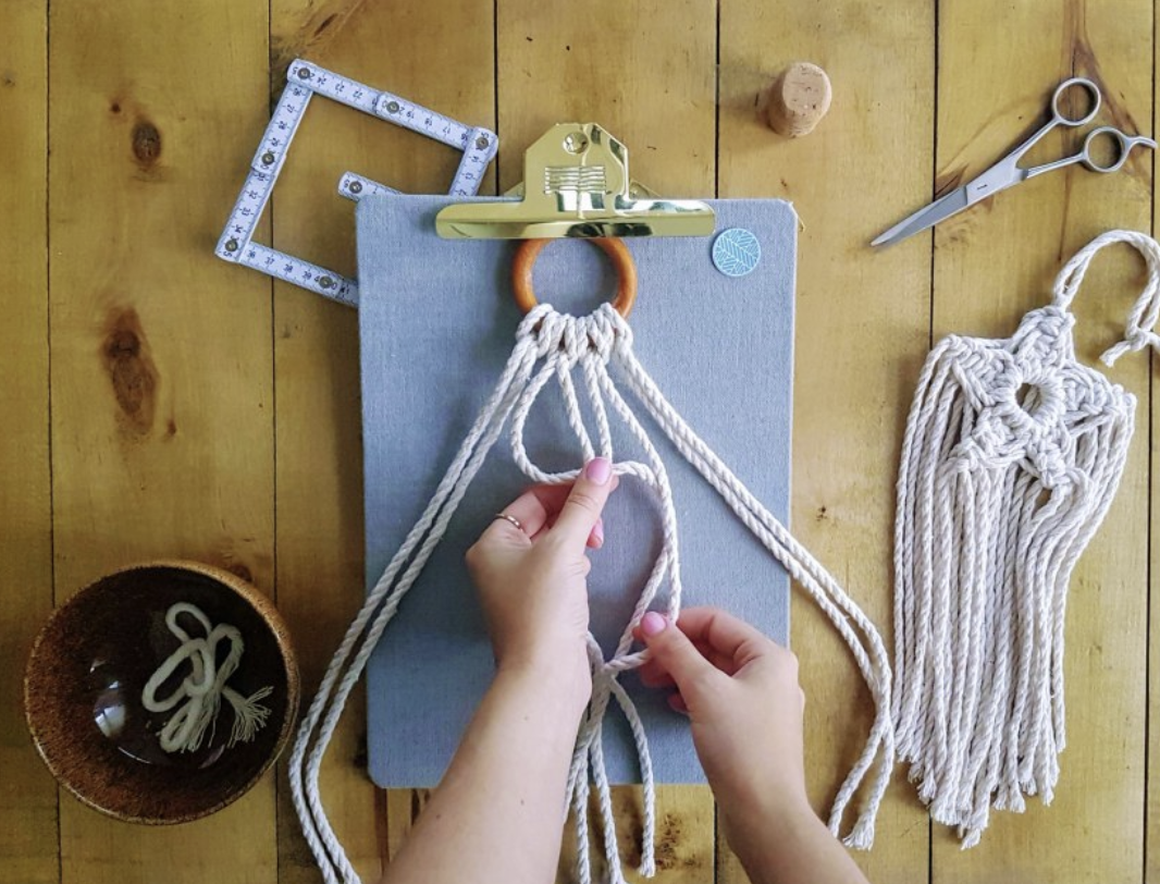 Все наши статьи про макраме здесь. Дорогие читатели! Мы любим экспериментировать с классическими приёмами плетения и создавать для вас доступные руководства, чтобы вы могли плести лёгкие, воздушные панно или аксессуары. Эти образцы позволяют тренировать плоские узлы и открывать, как изменение их расположения или роли нитей внутри даёт разные переплетённые текстуры. Мы начнём с простой чередующейся схемы и завершим перекрёстным плетением, которое кажется сложным, но на деле довольно просто! Каждый сетчатый мотив стартует одинаково: формируем петлю из базовой нити для работы, фиксируем её на доске для макраме (см. наши статьи про макраме) или на пробковой доске булавками. При завершении петля базовой нити послужит для подвешивания изделия. Приступим! Этот незатейливый мотив использует приём чередования плоских узлов, но с удвоением каждого перед сменой позиции в рядах для переменного эффекта. Материалы: • Один отрезок нити длиной 60 см толщиной 3 мм • Восемь отрезков нити длиной 120 см т