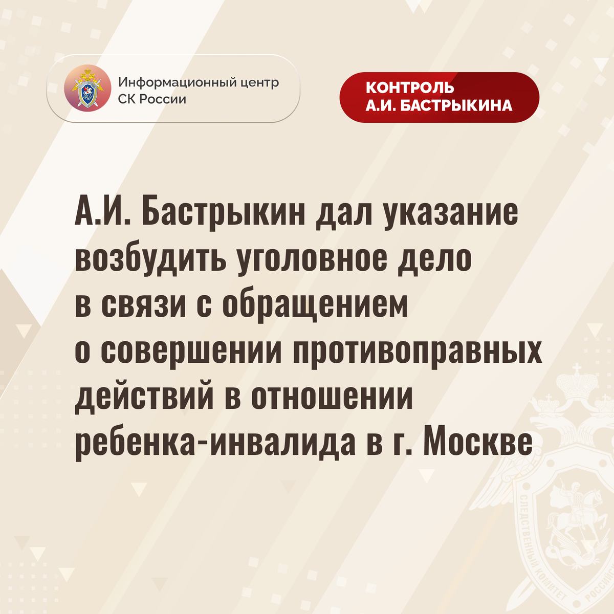 А.И. Бастрыкин дал указание возбудить уголовное дело в связи с обращением о совершении противоправных действий в отношении ребенка-инвалида в г. Москве