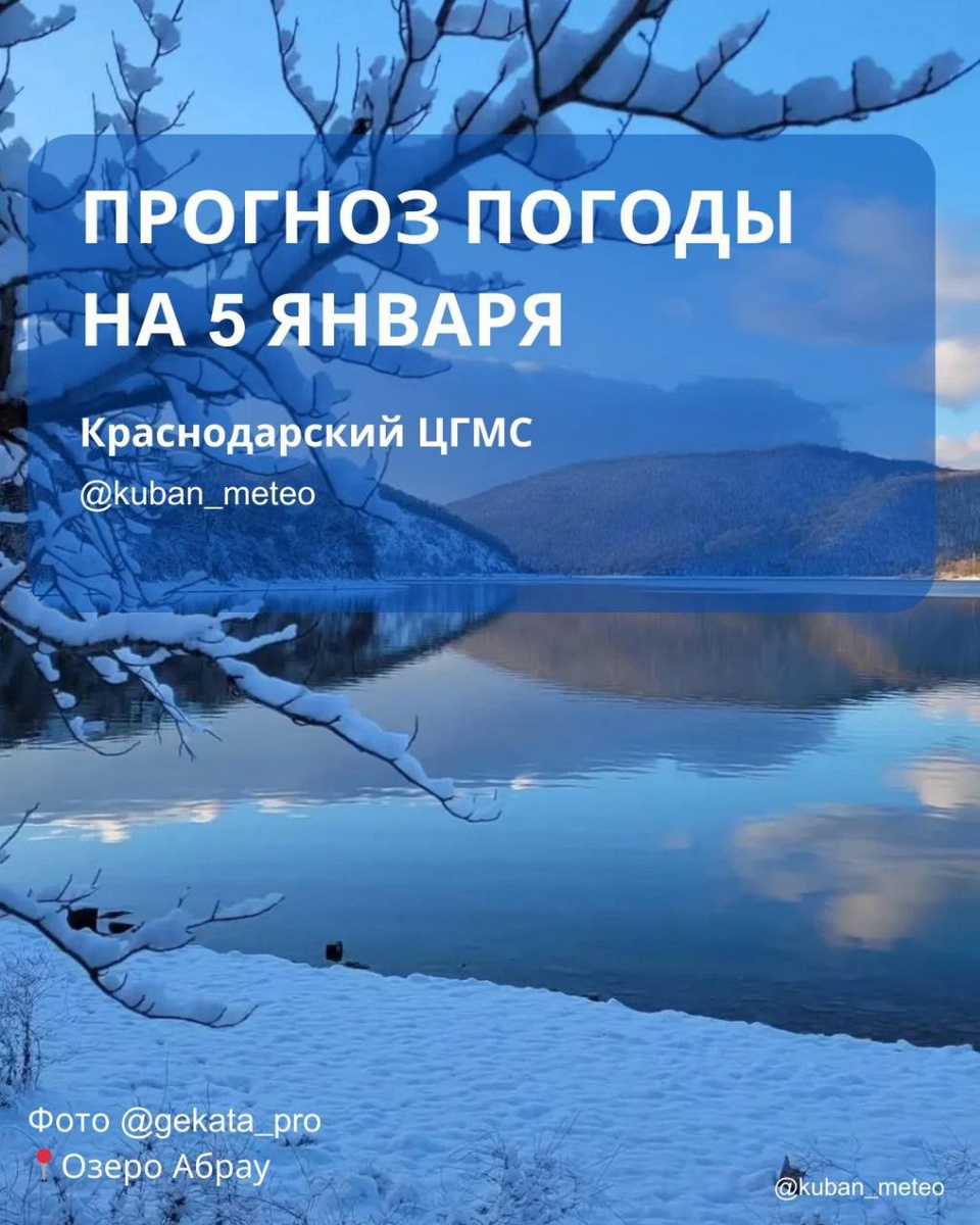 ☁️⛅⛈️ 🌧 Понедельник, 5 января 📍 Краснодарский край Переменная облачность. 🌧 Местами дождь, в отдельных районах сильный, в горах — мокрый снег и снег. ⛈ Местами сильный дождь, ливень в сочетании с грозой и сильным ветром с порывами 20–25 м/с, в горах 24–29 м/с (КМЯ). ⚠️ До конца суток 4 января местами в крае очень сильный ветер южной четверти с порывами 30–33 м/с (ОЯ). 💨 Ветер южной четверти 5–10 м/с, местами порывы 15–20 м/с, в горах 20–25 м/с. 🌡 Температура воздуха: ночью 6…11°, местами в восточной половине края 1…6°; днём 6…11°, местами в южной половине края 10…15°; 🌊 на Азовском побережье 3…8°; 🏔 в горах ночью 0…–5°, днём 0…+5°. 🌊 На Черноморском побережье 🌡 Температура воздуха ночью 6…11°, днём 10…15°. 📍 По г. Краснодару Переменная облачность. 🌥 Без существенных осадков. 💨 Ветер юго-западный 5–10 м/с, порывы 15–18 м/с. 🌡 Температура воздуха ночью 9…11°, днём 12…14°. С заботой, Краснодарский ЦГМС @kuban_meteo 💙