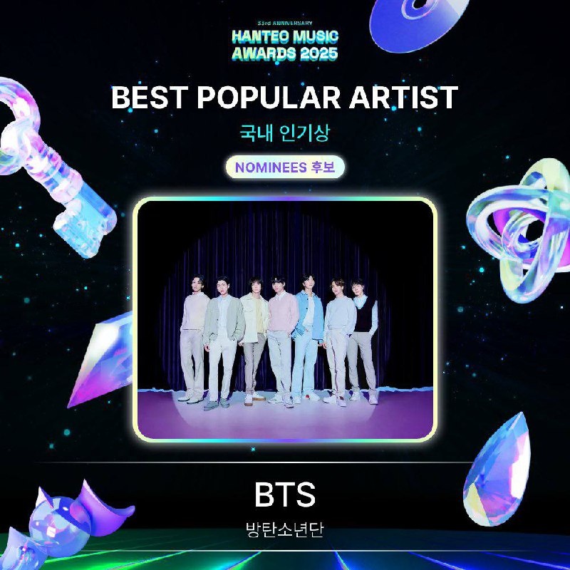 🍊 BTS, Джин и Джей-Хоуп номинированы в категории "Лучший популярный артист" на премии Hanteo Music Awards 2025.