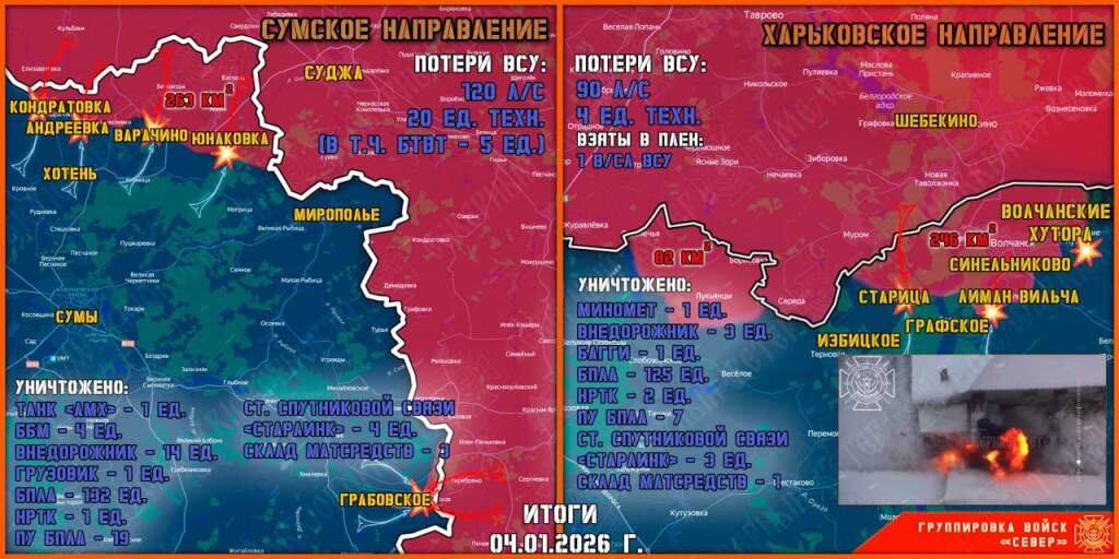 4 января группировка войск «Север» продолжила формирование полосы безопасности в Харьковской и Сумской областях. На Сумском направлении на всех участках фронта идут ожесточённые бои. Артиллерия и расчёты ударных БпЛА нарастили интенсивность ударов по позициям и логистике ВСУ. Отмечается высокая активность вражеских дронов, в том числе атаки по приграничным районам. Штурмовые группы продвинулись в Сумском районе на восьми участках фронта и ещё на пяти — в районе Грабовского. Суточное продвижение составило до 800 метров. В Краснопольский район противник перебрасывает подкрепления для удержания позиций и проведения контратак. На Тёткинском и Глушковском участках артиллерия группировки «Север» наносила удары по позициям ВСУ в районах Рыжевки и Искрисковщины.