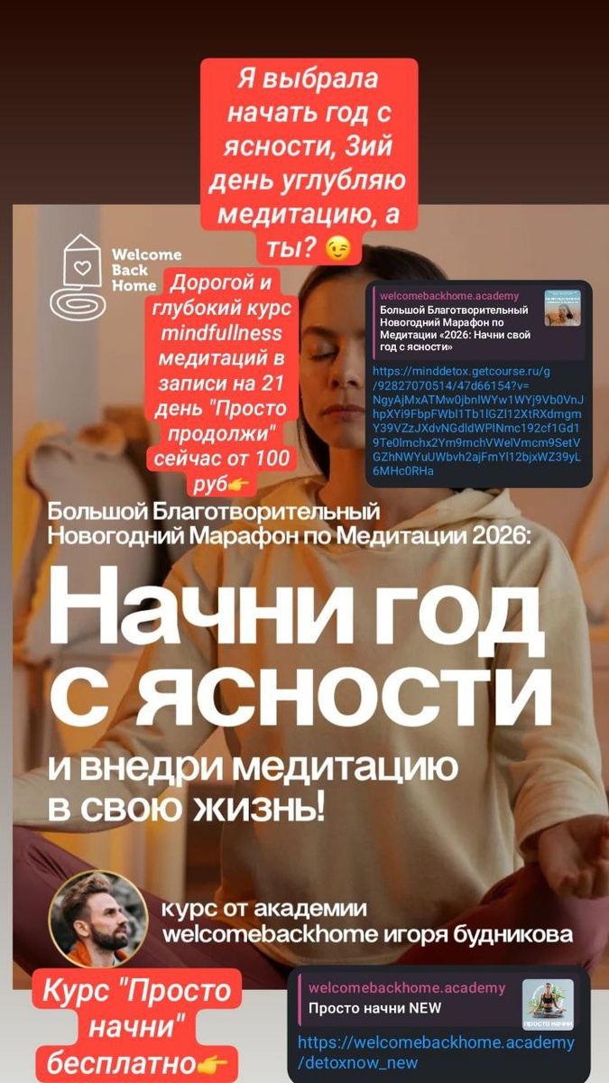 (мыслительный) и эмоциональный уровни от застаревших привычных реакций, благодаря ей легче новое мировоззрение управления реальностью встраивать. 1. Сейчас я прохожу курс "Просто продолжи", вообще он дорогой, но сейчас можно за 100 руб купить 21 день в записи (теория и практика): https://minddetox.getcourse.ru/g/92827070514/47d66154?v=NgyAjMxATMw0jbnlWYw1WYj9Vb0VnJhpXYi9FbpFWbl1Tb1lGZl12XtRXdmgmY39VZzJXdvNGdldWPlNmc192cf1Gd19Te0lmchx2Ym9mchVWelVmcm9SetVGZhNWYuUWbvh2ajFmYl12bjxWZ39yL6MHc0RHa 2. "Просто начни" раньше был бесплатно, 10 дней занятий в записи (теория и практика): https://welcomebackhome.academy/detoxnow_new ❣Всем ясности ума, повышения уровня осознанности и концентрации внимания для наболее лёгкого и эффективного управления своей реальностью!