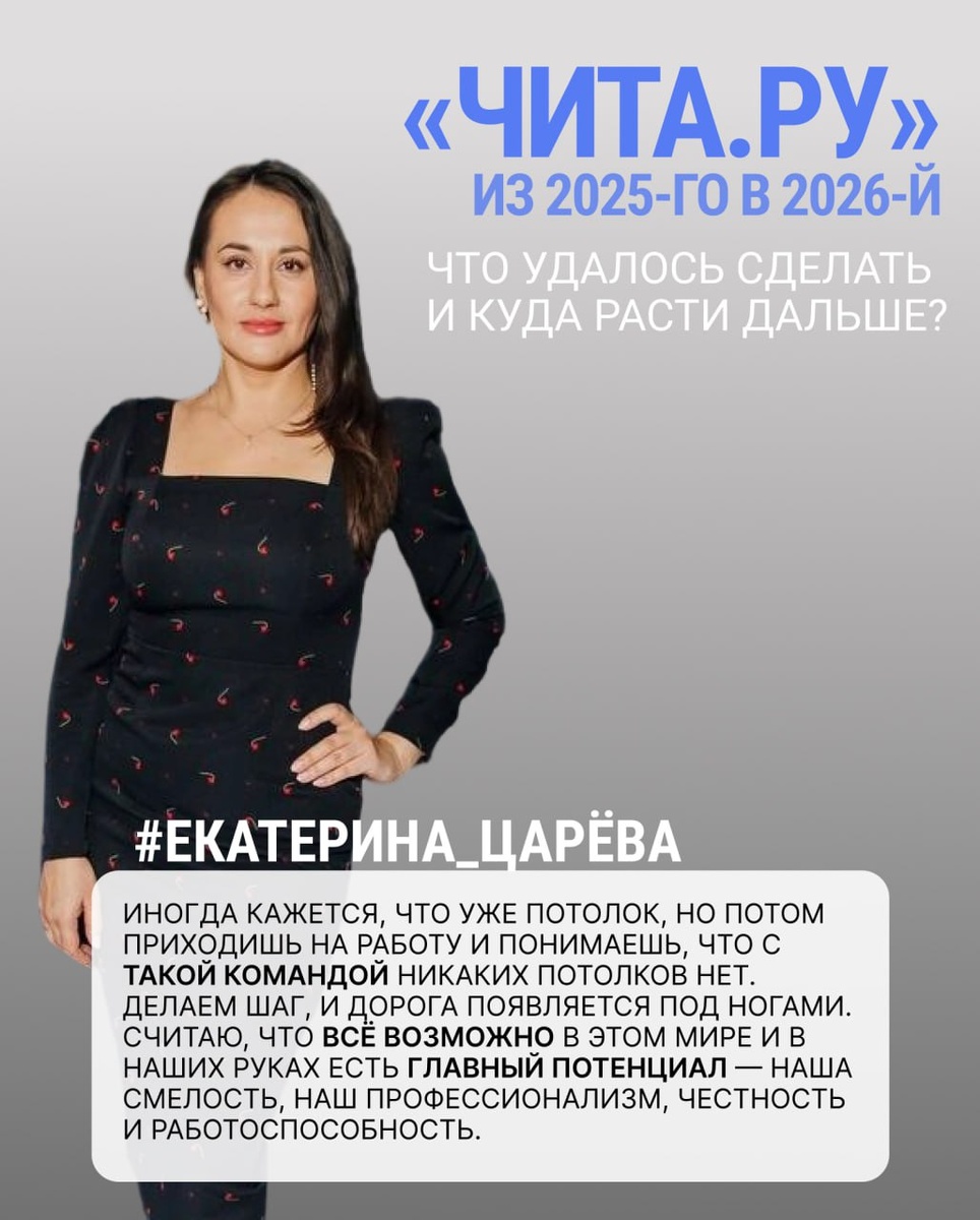 Что @chita.ru сделало в 2025 году и куда будет расти дальше? Продолжаем делиться мыслями о 2025 из традиционных итоговых писем читарушников. Вот что пишет коммерческий директор «Чита.Ру» Екатерина Царёва: В этом году мы провели экспертный Форум сильных, который оценили и в регионе, и за его пределами — руководство нашего холдинга намерено масштабировать эту идею на другие регионы. Идея форума — дать импульс и новые идеи для развития региона. Мы придумали и провели мероприятие Welcome Day — современную креативную ярмарку вакансий и дискуссионную площадку для HR подразделений. Кстати, в течение последних лет мы отлично поработали на своим HR-брендом и вышли на уровень работы с кадровым резервом и конкурсом на наши вакансии. Мы вынесли формат круглых столов за пределы Читы. Круглые столы стали реальным инструментом достижения самых разных общественных целей, публичного обсуждения задач и самое главное — решений многих вопросов. Приняли участие в организации книжного фестиваля «Забай