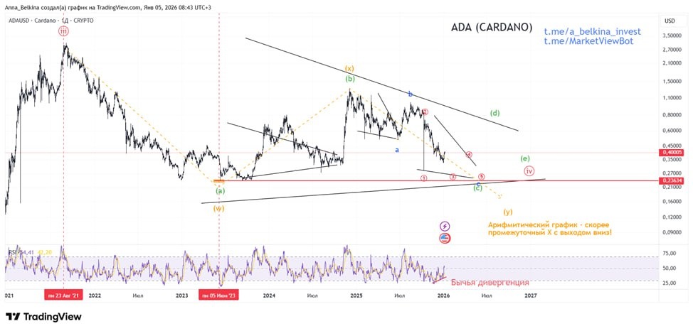 На общем фоне локального возврата позитива на рынке крипты (https://dzen.ru/media/id/65b8789ff12bfe0796a26941/video-6950fc94faea59566f87b7b1) начинают показывать отскок альты. На cardano, это волна B of (Y) of [3] нисходящей КД. На старшем ТФ отмечаю высокую вероятность движение в нисходящем двойном зигзаге, нежели боковое развитие в треугольнике (оранжевым), что особенно выраженно на арифметическом представлении графика. Не является ИИР 💪 БОЛЬШЕ разметок в Закрытом канале: Бот Закрытого Канала, доступен Пробный Период! (подписаться из-за границы, пишите личным сообщением)