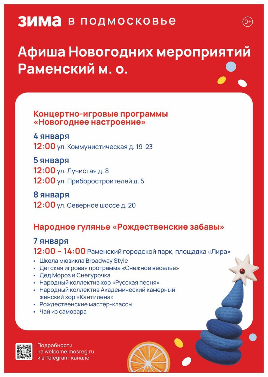 ⚡️Концертно-игровые программы «Новогоднее настроение» 🗓5 января 12:00 ул. Лучистая д. 8 12:00 ул. Приборостроителей д. 5 🗓8 января 12:00 ул. Северное шоссе д. 20 ⚡️Народное гулянье «Рождественские забавы» 🗓7 января 12:00-14:00 Раменский городской парк, площадка «Лира» 🔴Школа мюзикла Broadway Style 🔴Детская игровая программа «Снежное веселье» 🔴Дед Мороз и Снегурочка 🔴Народный коллектив хор «Русская песня» 🔴Народный коллектив Академический камерный женский хор «Кантилена» 🔴Рождественские мастер-классы 🔴Чай из самовара #ЗимаВРаменском #ЗимаВПодмосковье #РаменскийГородскойПарк 😊Онлайн эфир 😊Мы в ВК 😊Подписаться