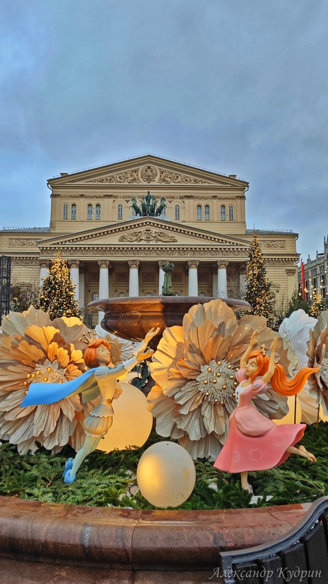 Это лучший способ бесплатно «посетить» премьеру главной зимней истории — «Щелкунчика». Не нужно ломать голову над билетами, просто приходи и гуляй среди декораций. Фигуры Щелкунчика и Мышиного короля замерли в вечном противостоянии прямо у стен храма высокого искусства. Возникает лёгкий диссонанс: одно дело — смотреть на эту битву из бархатного кресла под музыку Чайковского, и совсем другое, обходить её кругом, разглядывая детали при свете фонарей. Но самый неожиданный арт-объект здесь - это центральный фонтан, который зимой, конечно, не работает. Его чашу украсили огромными золотыми цветами из металла. Смотрится это волшебно: лёд, снег и холодное сияние позолоты создают фантастический контраст. А с чем лично у вас ассоциируется«Щелкунчик»? С детским утренником, запахом мандаринов, первой поездкой в настоящий театр или, может, со старым советским мультфильмом? Показать полностью...