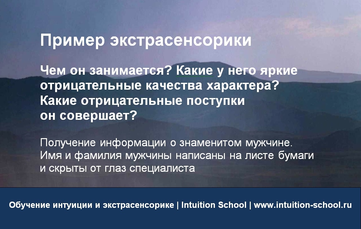 Дорогие друзья, хочу поделиться с вами примером ясновидения. Дата Январь 2026 г. Условия Моя помощница выбрала знаменитого человека, написала на листе бумаги его имя и фамилию, сложила листок, положила листок в черный конверт и передала конверт мне. Моя задача – получить информацию об этом человеке. Помощница сообщила мне, что это мужчина, наш современник. Я знала только то, что это мужчина, который является нашим современником. Моя задача – получить информацию об этом мужчине. Запрос Чем он занимается? Какие у него яркие отрицательные качества характера? Какие отрицательные поступки он совершает? Я стараюсь получить объективную, общую, по сути, принципиальную, точную информацию о человеке, которую можно проверить. Процесс Я выражаю намерение получить информацию по запросу. В течение нескольких минут происходит погружение в измененное состояние сознания (транс). И подсознание начинает передавать информацию: на мысленном экране возникают зрительные образы, возникает внутренний голос, к