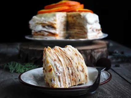 📖 Ингредиенты: * Для блинов (около 10 шт.): * Молоко — 500 мл * Яйца — 2 шт. * Мука — 200 г * Сахар — 2 ст.л. * Соль — щепотка * Растительное масло — 2 ст.л. ( + для жарки) * Для пьяных апельсинов и крема: * Апельсины — 2-3 крупных * Сахар — 200 г * Коньяк или ром — 100 мл * Сливочное масло — 300 г * Сгущенное молоко — 1 банка (380-400 г) 🧑🍳 Приготовление: 1. Блины: Взбейте яйца с сахаром и солью. Добавьте половину молока и муку, перемешайте до однородности. Влейте оставшееся молоко и масло. Жарьте тонкие блины на разогретой сковороде. 2. Пьяные апельсины: Очистите апельсины от кожуры и нарежьте тонкими полукольцами. В сотейнике смешайте сахар и 100 мл воды, доведите до кипения. Добавьте апельсины и тушите 5-7 минут. Влейте коньяк, прогрейте и снимите с огня. 3. Крем: Масло комнатной температуры взбейте в пышную пену. Не прекращая взбивать, постепенно вливайте сгущенное молоко. 4. Сборка: Каждый блин смажьте кремом. Часть апельсинов мелко порубите и